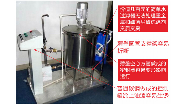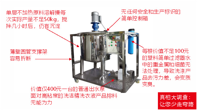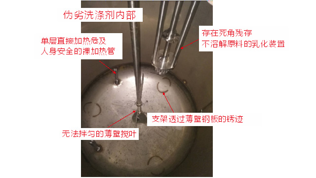 五、項(xiàng)目加盟騙局提供的洗潔精設(shè)備、洗衣液設(shè)備,大都是單層不加熱或單層攪拌機(jī)內(nèi)部用發(fā)熱管直接加熱,當(dāng)燒堿、尿素、磺酸等化工原料長期接觸設(shè)備內(nèi)部的發(fā)熱管后就會(huì)腐蝕,腐蝕后的的銹斑首先會(huì)導(dǎo)致洗滌產(chǎn)品和車用尿素重金屬增加及產(chǎn)品外觀顏色渾濁,還會(huì)引起產(chǎn)品中細(xì)菌滋生變質(zhì)變臭,更嚴(yán)重的是攪拌機(jī)內(nèi)部的發(fā)熱管腐蝕后導(dǎo)電引發(fā)人身安全危機(jī);