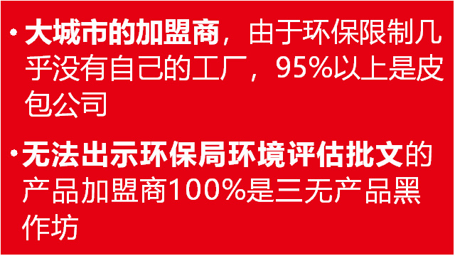 二、加盟騙局實(shí)施者雖有營業(yè)執(zhí)照和常規(guī)手續(xù),但沒有環(huán)保局頒發(fā)的的項(xiàng)目環(huán)評(píng)報(bào)告書,實(shí)際上就是一個(gè)沒有實(shí)體工廠的皮包公司;