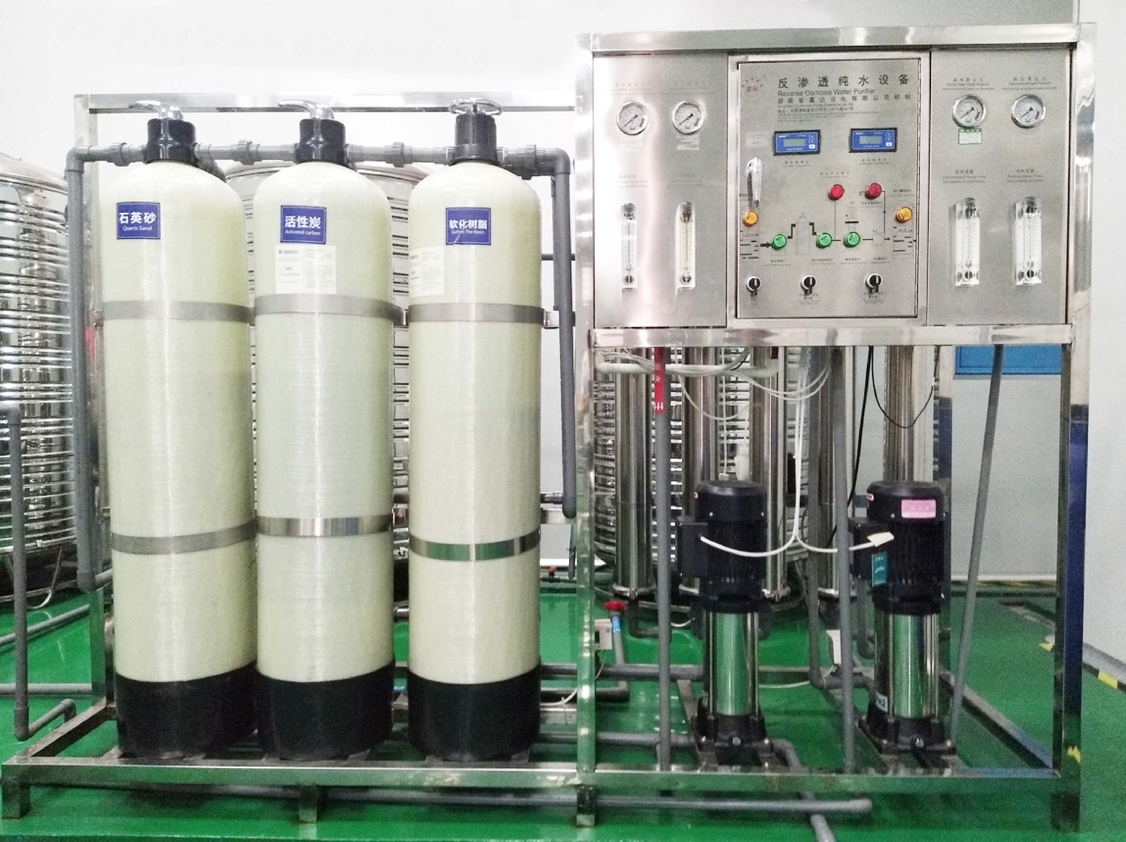 主機(jī)架、原水泵、石英砂過濾器、活性炭過濾器、3級保安過濾器、高壓泵、普配反滲透膜。 |