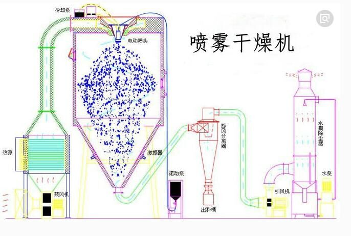 工藝原理:空氣經(jīng)過濾和加熱,進(jìn)入干燥器頂部空氣分配器,熱空氣呈螺旋狀均勻地進(jìn)入干燥室。料液經(jīng)塔體頂部的高速離心霧化器,(旋轉(zhuǎn))噴霧成極細(xì)微的霧狀液珠,與熱空氣并流接觸在極短的時(shí)間內(nèi)可干燥為成品。成品連續(xù)地由干燥塔底部和旋風(fēng)分離器中輸出,廢氣由引風(fēng)機(jī)排空。