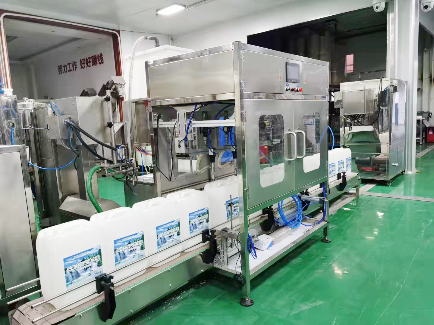 8、成品車用尿素溶液經(jīng)過每小時產(chǎn)量1500-2000公斤的高效氣動重力灌裝機罐裝,在經(jīng)過擰蓋機或人工擰蓋、鋁箔機封口,貼標即為標準車用尿素容易成品。