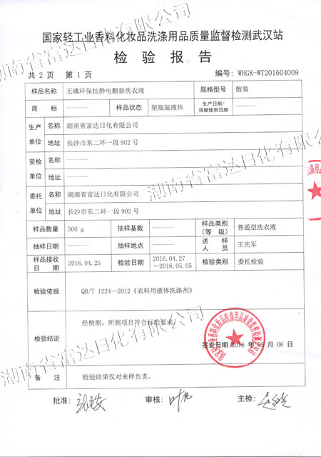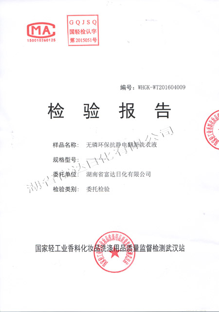 多項專利發(fā)明人王先軍 手機:150-7483-5702 手機:195-7316-02882016年4月,富達日化用戶周先生反饋: 在周先生銷售洗衣液、洗滌劑的周邊,有一種翻新洗衣液很走俏,他想加盟,可加盟門檻很高,問公司能否生研發(fā)生產(chǎn)出類似的產(chǎn)品。收到客戶的反饋后,作為多項專利的發(fā)明人,早在10年前就根據(jù)氧化還原反應原理研究過衣物翻新洗衣液。經(jīng)過2個多月的研發(fā),無磷環(huán)??轨o電衣物翻新洗衣液按照國家標準研發(fā)成功,并送檢國家輕工業(yè)質(zhì)量監(jiān)督檢測武漢站,于5月下旬通過環(huán)評檢測。