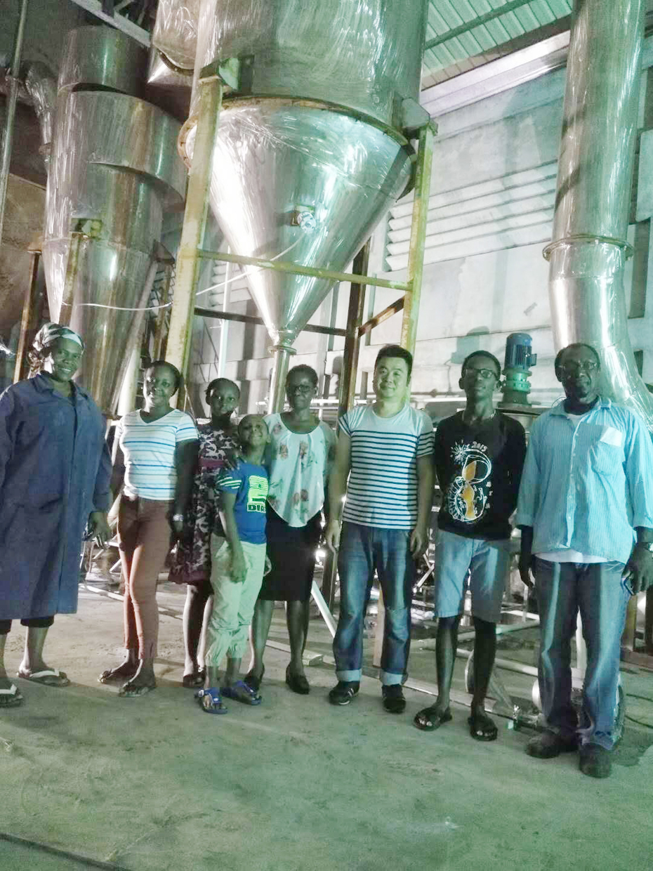 工藝原理:空氣經(jīng)過濾和加熱,進(jìn)入干燥器頂部空氣分配器,熱空氣呈螺旋狀均勻地進(jìn)入干燥室。料液經(jīng)塔體頂部的高速離心霧化器,(旋轉(zhuǎn))噴霧成極細(xì)微的霧狀液珠,與熱空氣并流接觸在極短的時(shí)間內(nèi)可干燥為成品。成品連續(xù)地由干燥塔底部和旋風(fēng)分離器中輸出,廢氣由引風(fēng)機(jī)排空。