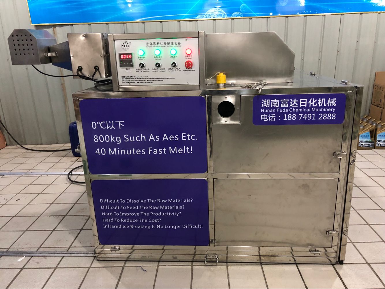 多項(xiàng)專利發(fā)明人王先軍 手機(jī):150-7483-5702 手機(jī):195-7316-0288AES等洗滌產(chǎn)品原料快速溶解有辦法,最近,由湖南省富達(dá)日化有限公司100多項(xiàng)國家專利申請(qǐng)人王先軍博士研發(fā)的一種紅外解凍設(shè)備,可以快速解決低溫狀態(tài)下化工原料冰凍后加料難、取料難的問題,廣泛用于洗滌產(chǎn)品生產(chǎn)需要。